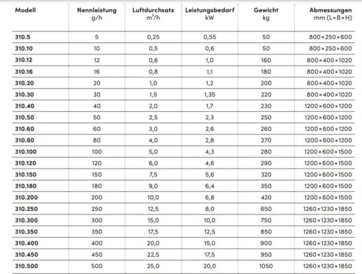 Tùy thuộc vào kích cỡ, dòng Multizon có thể tạo ra lượng ozone từ 5 đến 500 g/giờ ở nồng độ khoảng 20 g/m³.